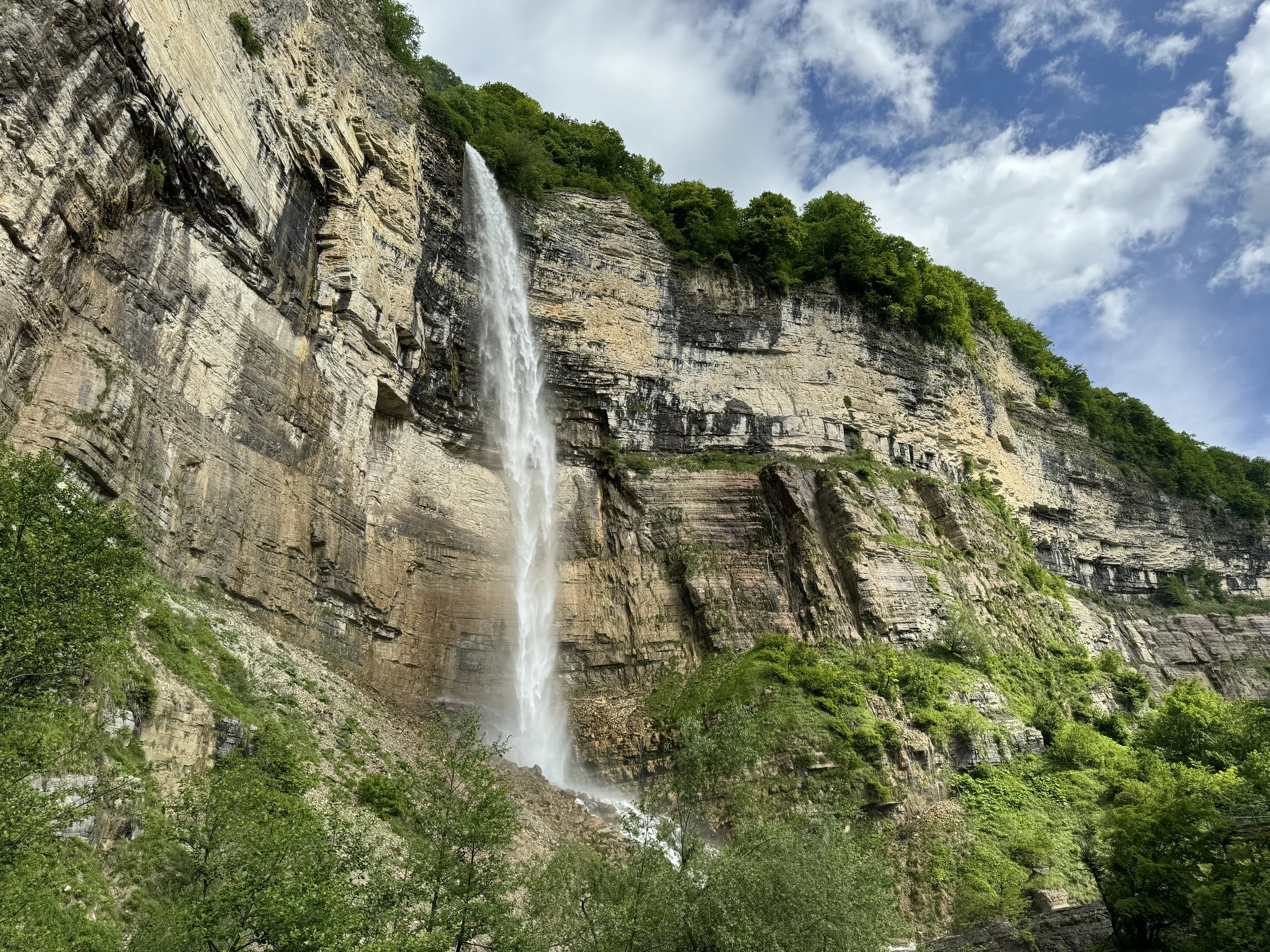 The Okatse waterfalls are in a river gorge. A brand new boardwalk leads along a cascade of waterfalls, the tallest 70 meters high. Guards keep an eye on the visitors. I arrived just after the ticket booth opened while there were few other visitors. The waterfalls are beautiful, very accessible and probably very crowded once the tour groups arrive. The next stop would be way harder to reach.